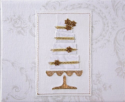 A tiered wedding cake created from layers of fabric and gold stitching and finished with floral sequins makes this the perfect wedding album.