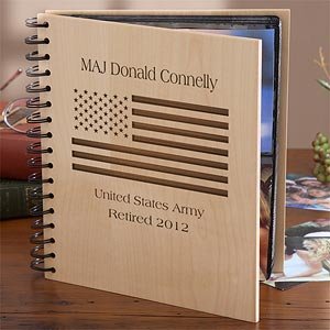 We'll artfully laser-engrave your choice of any three lines, placed outside our American Flag design, to honor any serviceman or woman! Natural maple veneer with spiral binding. Album Size: 7 2/3" x 8 3/4" Photo Size: 4" x 6" No. of Photos: 72 (18 pages; 4 photos per page) A wonderful way to pay tribute to our American heroes!