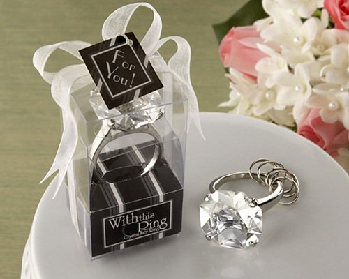Sparkling from every facet, this beautiful crystal "diamond" is a stunning, oversize replica of the real thing, with enough expertly designed details to turn heads! As you've probably guessed, these exquisite engagement-ring key chains make excellent bridesmaids favors and gifts for bridal shower guests?